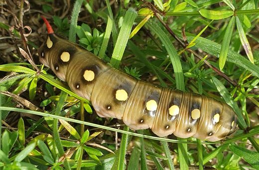 Beim Spazierengehen in einer Rhöner Wiese entdeckt: die Raupe des Labkrautschwärmers - auffällig der rote Stachel am Ende (Analhorn) und die gelben Augen seitlich.