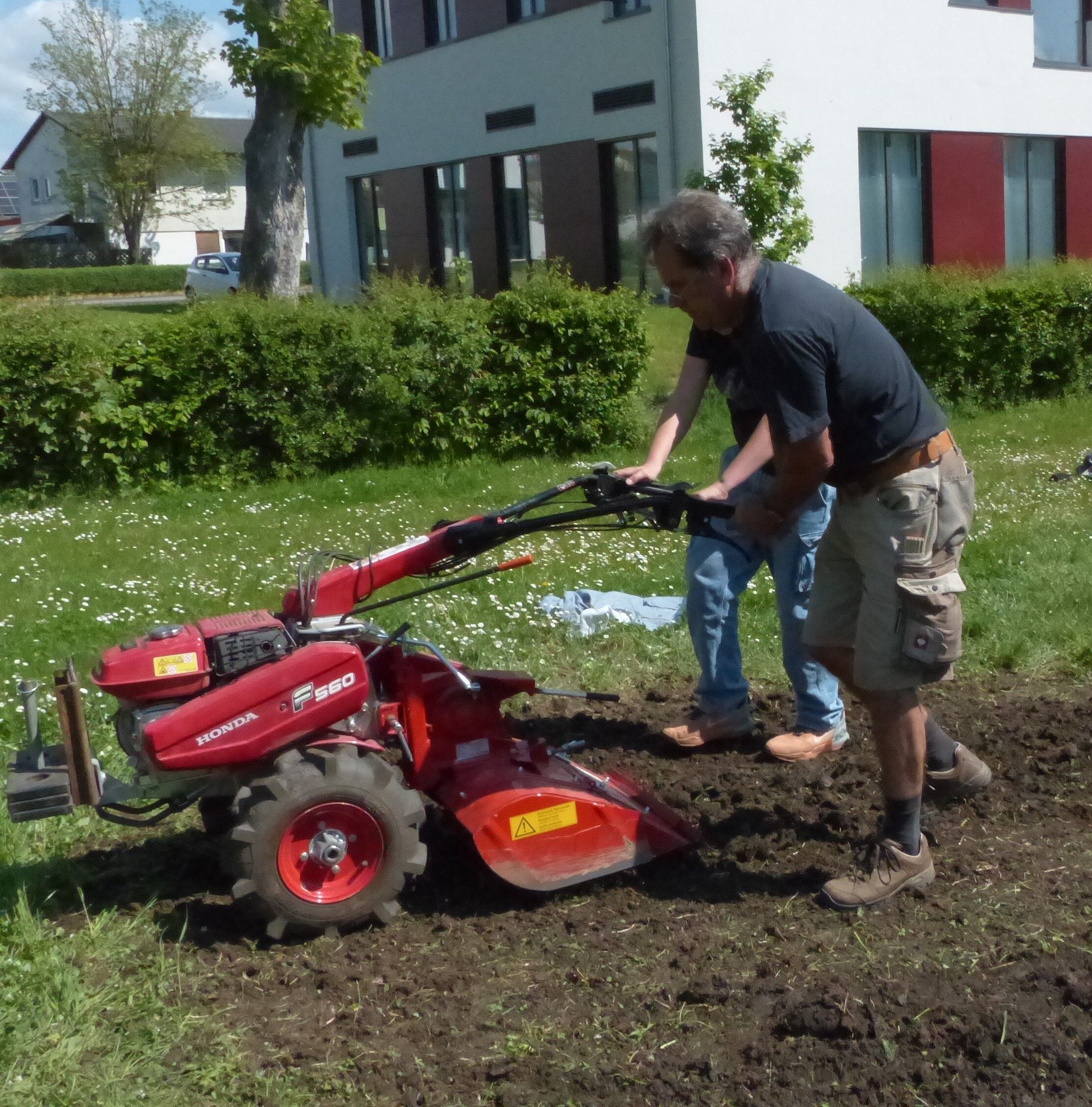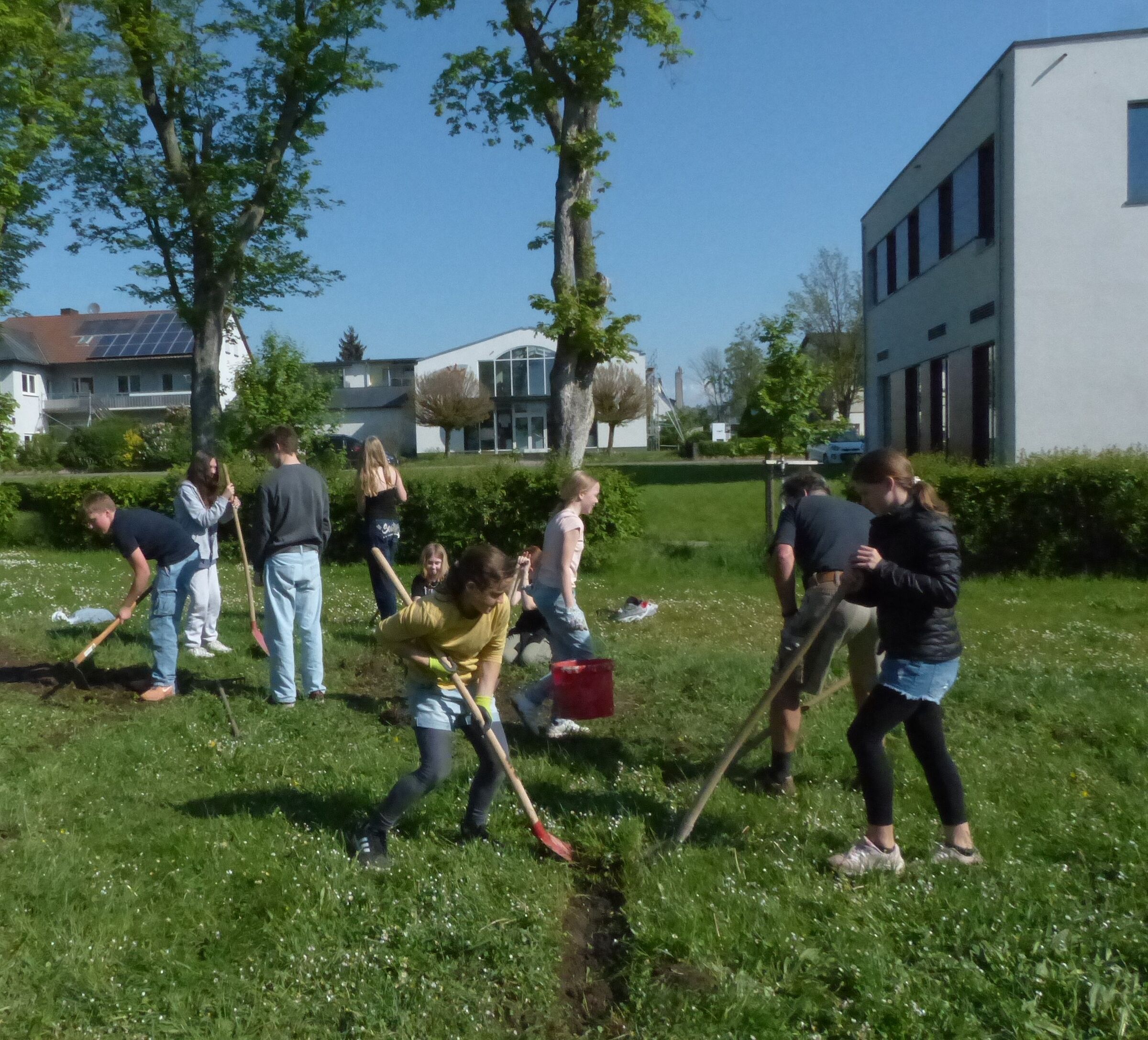 Im Rahmen eines Projekttages am Gymnasium Bad Königshofen wurde im Eingangsbereich der Schule gemeinsam mit engagierten Schülerinnen und Schülern der 5. und 7. Jahrgangsstufe eine Blühwiese angelegt. Unter Anleitung von Dieter Jetschni, dem 1. Vorsitzenden der Ortsgruppe, kennzeichneten die Kinder zunächst den Bereich, in dem in Zukunft an Stelle von Rasen viele Pflanzen erblühen sollen. Anschließend kam die Knochenarbeit: Das Abheben der Grasnarbe mit Hacken und Schaufeln. Dieser Arbeitsgang war für alle Beteiligten bei sommerlichen Temperaturen sehr schweißtreibend und benötigte viel Zeit und Durchhaltevermögen. Als nächsten Arbeitsschritt schloss sich das Fräsen des Bodens an, was wegen der starken Verdichtung ebenfalls sehr mühevoll war. Danach wurde die Fläche planiert und schließlich eingesät. Viel Spaß hatten die Schülerinnen und Schüler beim letzten Arbeitsgang, dem Walzen. Zur Belohnung gab es am Ende noch Schulgarten-Apfelsaft, spendiert von Silvia Jetschni, der zuständigen Biologielehrerin und Mitglied im Ortsgruppenvorstand.
