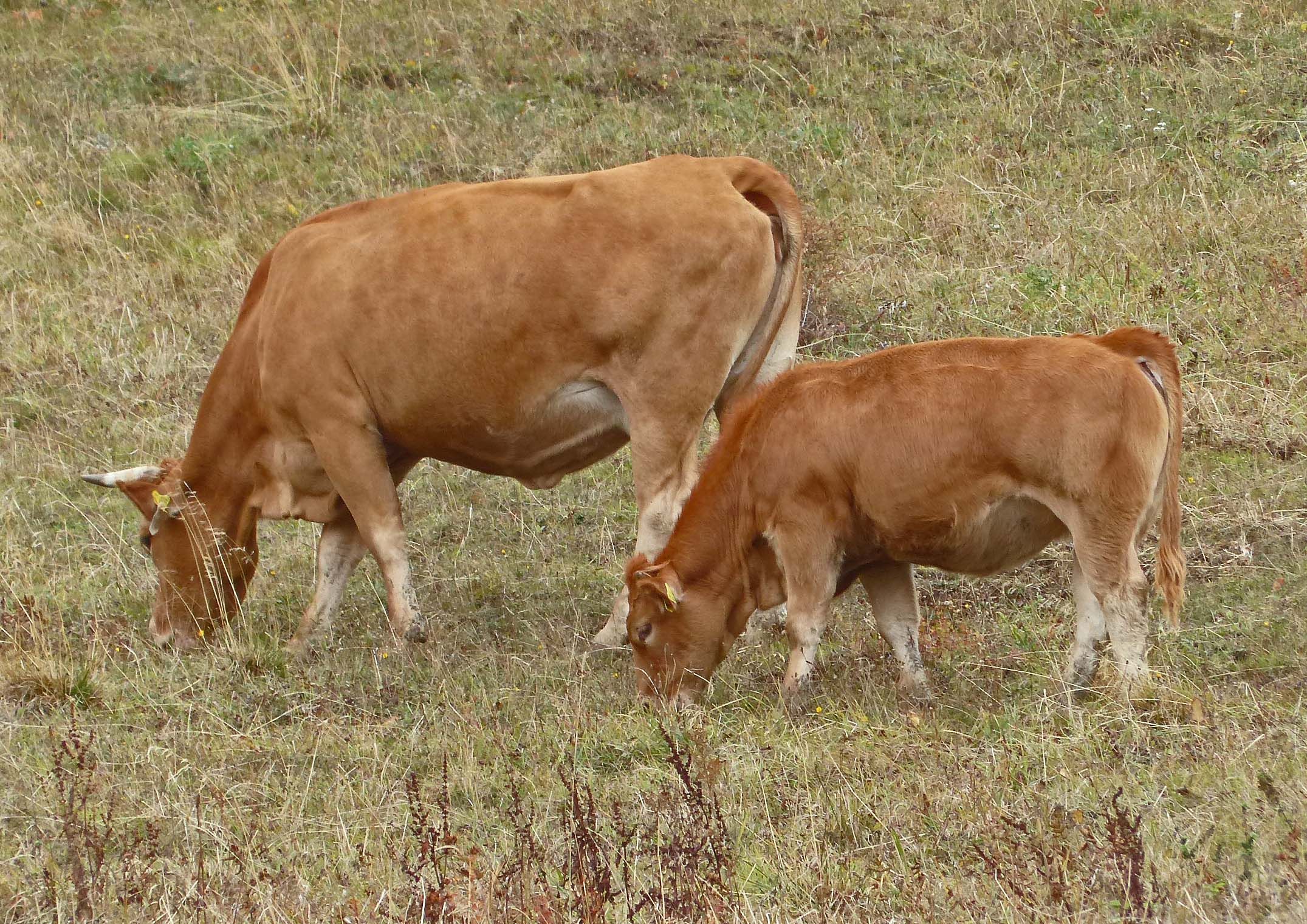 Bei der Weide mit den Kühen und ihren Kälbern (s.Bild) wurde die Gruppe von Klaus Manger erwartet, dem Züchter der fast ausgestorbenen Rasse des fränkischen Gelbviehs. Die Kühe leben mit den Kälbern den ganzen Sommer über auf der Weide und fressen Gras und im Winter das selbst erzeugte Futter. Auf den Hochrhönweiden gab es auch in diesem Sommer genug Wasser aus einer Quelle, allerdings zuletzt zu wenig Gras, so dass die eigenen Heubestände herangezogen werden mussten. Der Trockenheit war es auch geschuldet, dass die Ochsen bereits im offenen Laufstall auf dem Hof waren, in den mittlerweilen beim Weideabtrieb auch die Kühe mit den Kälbern gebracht wurden. Manger betonte, dass sich seine Rinder wohlfühlen. Und damit das bis zur Schlachtung der Ochsen und Färsen auch so bleibt, begleitet sie der gelernte Metzger in die nahe gelegene Schlachterei in Oberweißenbrunn. Fleisch kann man beim Biohof Manger bestellen oder in einer Bischofsheimer Metzgerei kaufen.