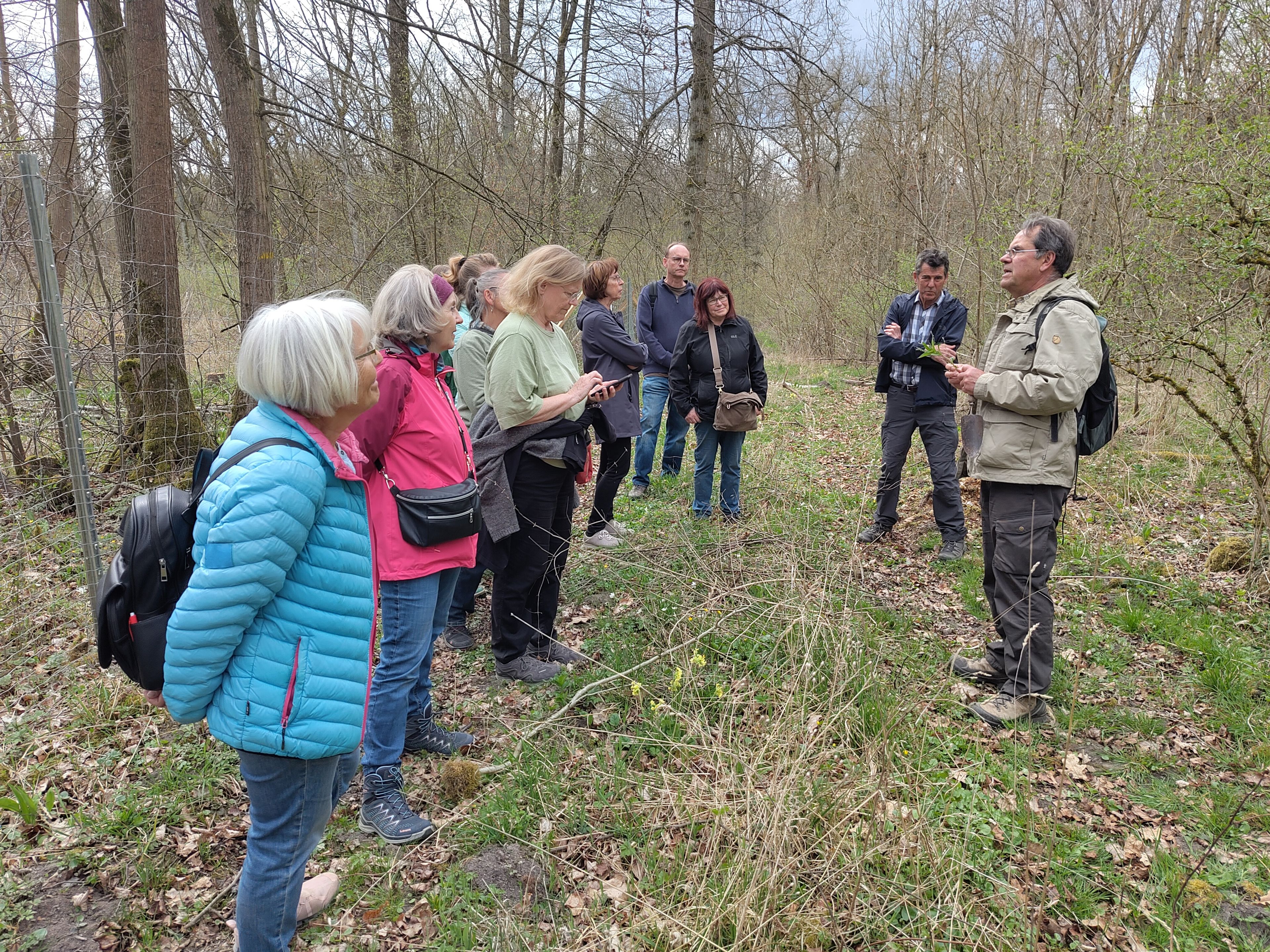 „Was blüht denn da?“ und „Welcher Vogel singt da?“, diese Fragen wurden bei der naturkundlichen Wanderung durch den Spitalwald beantwortet, die der BUND Naturschutz traditionell im Frühjahr anbietet und die von Dieter Jetschni, dem 1. Vorsitzenden der Ortsgruppe und Barbara Schmitt geleitet wurde. Dabei ging es bei den Pflanzen weit über das bloße Ansprechen der Arten hinaus. So erfuhren die Exkursionsteilnehmer viel über verschiedene Strategien, um Fremdbestäubung zu verhindern. Besonders anschaulich war das am Beispiel der Schlüsselblume zu erkennen, wo es bei den beiden heimischen Schlüsselblumenarten sowohl kurzgrifflige als auch langgrifflige Varianten gibt, die dadurch eine Selbstbestäubung verhindern. Blütenbiologisch besonders ist auch der Gleitfallenmechanismus beim Aronstab, der die bestäubenden Schmetterlingsmücken durch einen intensiven Aasgeruch der Blüte, die bis zu 40°C warm werden kann, anlockt. Ganz anders der Pfeffergeruch der Haselwurz, deren Blüte in der Laubstreu steckt und die von Schnecken bestäubt wird. Alle Gerüche des Waldes werden im Frühjahr überlagert durch den Bärlauch, der in großen Teilen des Spitalwaldes bestandbildend ist. Vielfältig ist die Nutzung der Pflanze als Beigabe für Quark, Soßen, Salate und Suppen oder als Bärlauchpesto. Es wurde ausdrücklich auf die Verwechslungsgefahr mit den Blättern der Herbstzeitlose hingewiesen, von der bereits 60 Gramm tödlich giftig sind. Auch das Thema Fuchsbandwurm wurde angesprochen. Kaum jemanden sind die vielfältigen Nutzungsmöglichkeiten des Scharbockskrauts als Vitamin C- und Mehllieferant oder als Kapernersatz bekannt. Insgesamt lernten die Exkursionsteilnehmer 30 verschiedenen Pflanzen mit ihren biologischen Besonderheiten kennen.